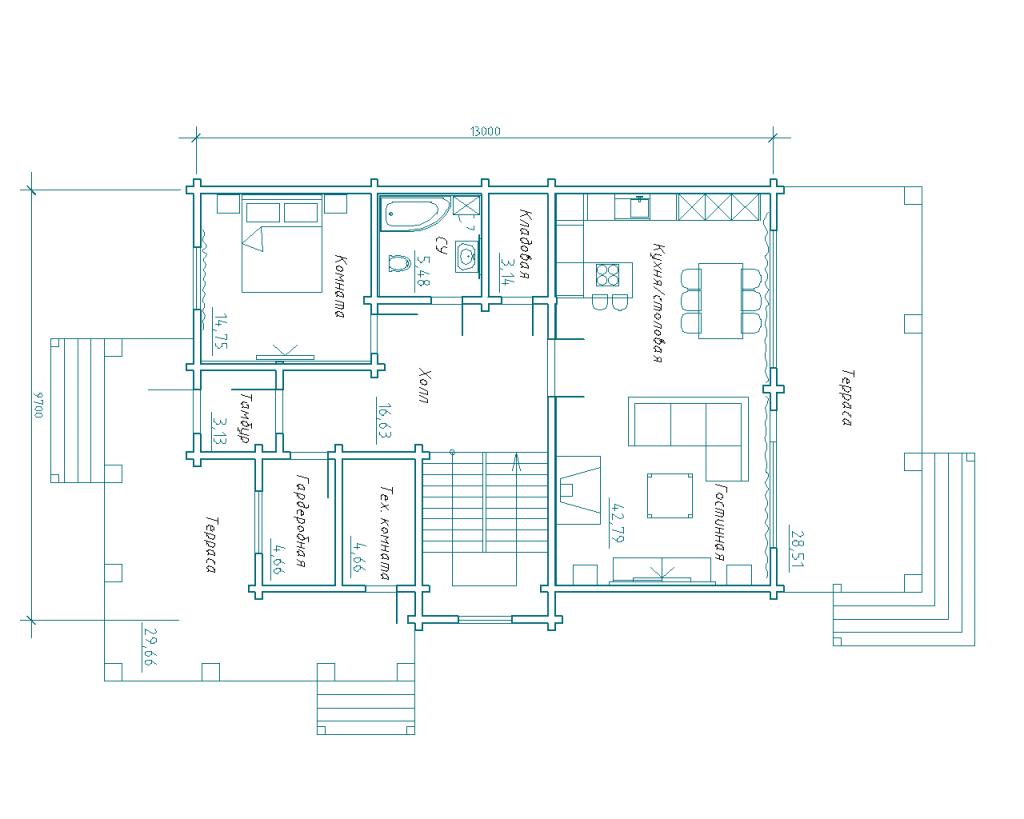 Конструктор сруба изготовлен на собственной производственной базе компании. Общая площадь дома 219,70 м2.